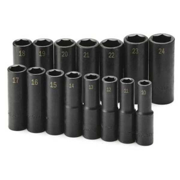 (15) 1/2" Drive Deep High Visibility Impact Socket: 10mm, 11mm, 12mm, 13mm, 14mm, 15mm, 16mm, 17mm, 18mm, 19mm, 20mm, 21mm, 22mm, 23mm, 24mm; Rail