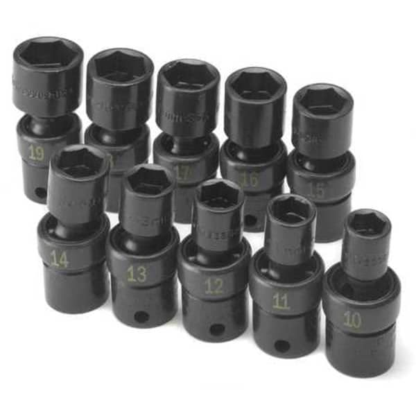 Impact Socket Set, Standard Socket Count/Style None, Deep Socket Count/Style None, Flex Socket Count/Style (10) 6-Point, Flex Socket Style/Size Flex 6-Point: 10 mm, 11 mm, 12 mm, 13 mm, 14 mm, 15 mm, 16 mm, 17 mm, 18 mm, 19 mm, Impact, Drive Size 3/8 in, Metric, 6-Point, Black Oxide