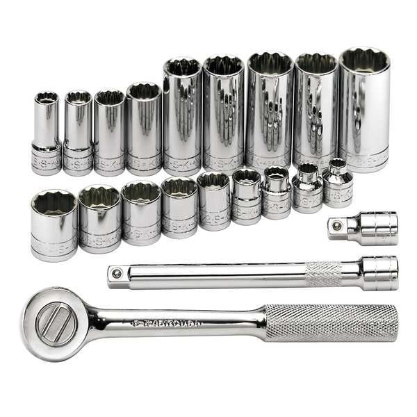 3/8" Drive Ratchet/Socket Set, SAE, 21pcs, Skt Wrch St, Chrm, 12Pt, 1/4 - 7/8 in