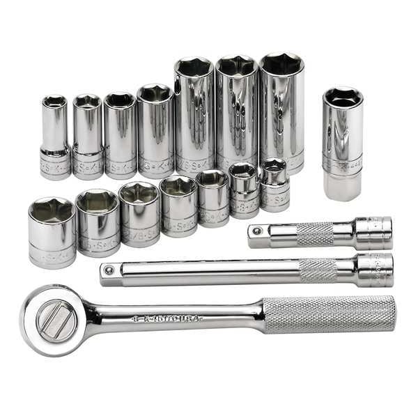 This SK Professional Tools 94520 3/8 in. Drive Socket Set is a complete set of tools that comes with an 18-piece set and a plastic case for easy storage. It has a 3/8" hand driver, which makes it easy to access tight spaces and control the tool precisely. The chrome finish ensures protection against corrosion, so you can use these tools confidently in harsh conditions. The socket size range from 3/8" to 3/4", while the deep socket point styles included are 6. The alloy steel material gives these tools strength and durability, so they will last for years to come. This SK Professional Tools' 94520 3/8 in Drive Socket Set is made from high quality materials that ensure its durability and reliability when working on your projects.