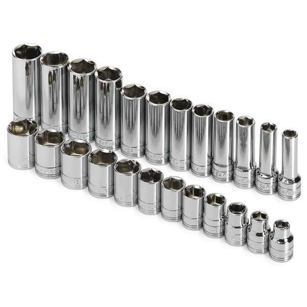 (12) 3/8" Drive 6 Point Standard Socket: 8mm, 9mm, 10mm, 11mm, 12mm, 13mm, 14mm, 15mm, 16mm, 17mm, 18mm, 19mm; (8) 3/8" Drive 6 Point Extra Long Deep Socket: 8mm, 9mm, 10mm, 11mm, 12mm, 13mm, 14mm, 15mm; (4) 3/8" Drive 6 Point Deep Socket: 16mm, 17mm, 18mm, 19mm; Socket Rail