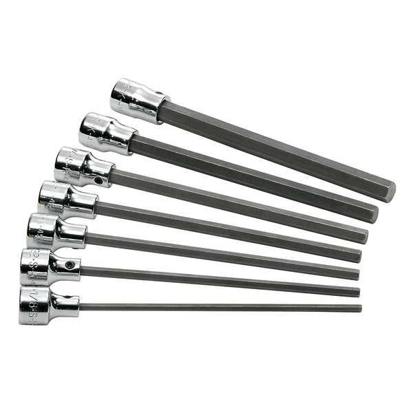 Socket Bit Set, Tip Size 1/4 in, 1/8 in, 3/16 in, 3/8 in, 5/16 in, 5/32 in, 7/32 in, Tip Style Hex, Overall Length 6 3/64 in, Drive Size 3/8 in, Number of Pieces 7, Alloy Steel, Chrome, SAE, Insulated No, For Screw Type Hex