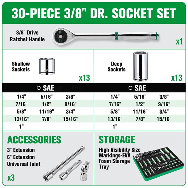 Drive SAE Chrome Socket Set 3/8 In.,30 pc