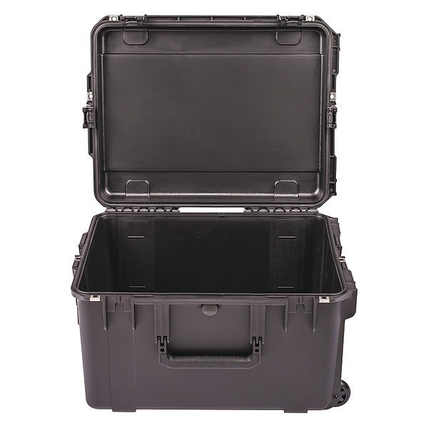 Protective Case, Bottom Depth 10 3/4 in, Closure Type Latches, Color Black, Electrostatic Discharge Not Electrostatic Discharge Conductive, Foam Design No Foam, Handle Style Folding, Telescoping, Includes Foam Insert Foam Insert Not Included, Inside Depth 12 3/4 in, Inside Length 22 in, Inside Width 17 in, Lid Depth 2 in, Material Plastic, Maximum Operating Temperature 180 Degrees F, Minimum Operating Temperature -60 Degrees F, Number of Latches 4, Number of Wheels 2, Overall Depth 14 3/8 in