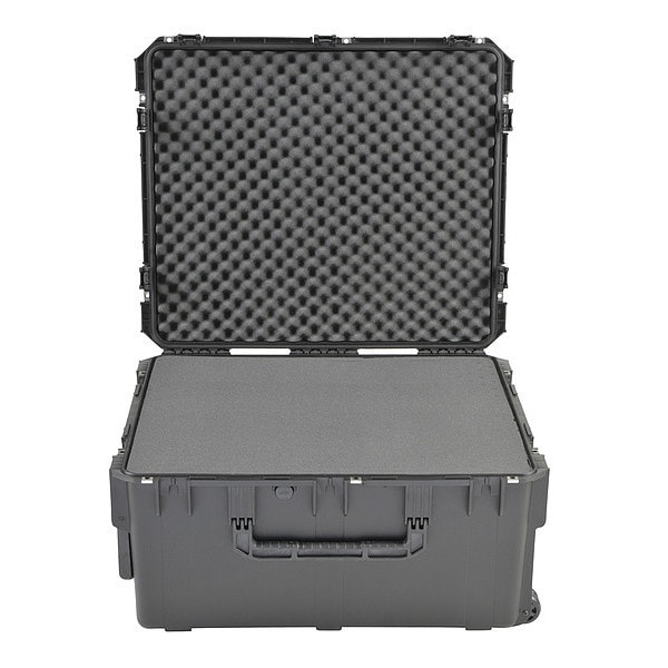 Protective Case, Bottom Depth 13 1/2 in, Closure Type Latches, Color Black, Electrostatic Discharge Not Electrostatic Discharge Conductive, Foam Design Pick and Pluck, Handle Style Folding, Telescoping, Includes Foam Insert Foam Insert Included, Inside Depth 15 1/2 in, Inside Length 30 3/4 in, Inside Width 26 in, Lid Depth 2 in, Material Plastic, Maximum Operating Temperature 180 Degrees F, Minimum Operating Temperature -60 Degrees F, Number of Latches 7, Number of Wheels 2