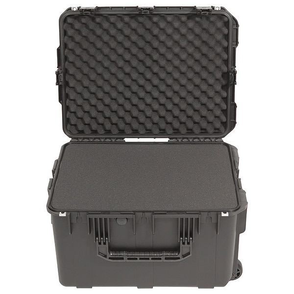 Protective Case, Bottom Depth 11 1/2 in, Closure Type Latches, Color Black, Electrostatic Discharge Not Electrostatic Discharge Conductive, Foam Design Pick and Pluck, Handle Style Folding, Telescoping, Includes Foam Insert Foam Insert Included, Inside Depth 14 in, Inside Length 23 in, Inside Width 17 in, Lid Depth 2 1/2 in, Material Plastic, Maximum Operating Temperature 180 Degrees F, Minimum Operating Temperature -69 Degrees F, Number of Latches 4, Number of Wheels 2, Overall Depth 15 3/4 in