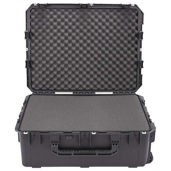 Protective Case, Bottom Depth 8 1/2 in, Closure Type Latches, Color Black, Electrostatic Discharge Not Electrostatic Discharge Conductive, Foam Design Solid, Handle Style Folding, Includes Foam Insert Foam Insert Included, Inside Depth 10 1/2 in, Inside Length 29 in, Inside Width 22 in, Lid Depth 2 in, Material Plastic, Maximum Operating Temperature 180 Degrees F, Minimum Operating Temperature -69 Degrees F, Number of Latches 7, Number of Wheels 2, Overall Depth 12 1/4 in