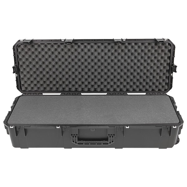 Protective Case, Bottom Depth 8 in, Closure Type Latches, Color Black, Electrostatic Discharge Not Electrostatic Discharge Conductive, Foam Design Solid, Handle Style Folding, Includes Foam Insert Foam Insert Included, Inside Depth 10 in, Inside Length 44 1/2 in, Inside Width 14 1/2 in, Lid Depth 2 in, Material Plastic, Maximum Operating Temperature 180 Degrees F, Minimum Operating Temperature -69 Degrees F, Number of Latches 6, Number of Wheels 2, Overall Depth 10 7/8 in, Overall Length 47 in