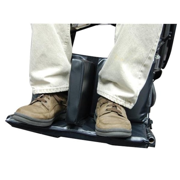 A wheelchair foot support that controls foot drop, prevents legs from slipping behind the footrest, from contacting metal surfaces, and has a removable leg divider to provide leg separation. The foot separator can be removed to convert the unit to a standard footrest extender. It also raises the leg rest platform so that shorter residents legs can reach the footrest. It is covered in durable wipe-clean vinyl and with two quick release buckle straps they can be quickly and easily attached to any wheelchair. This model is provided with a 3" foot separator.