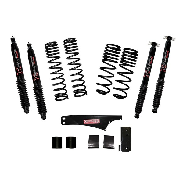 2 To 2-1/2 Inch Front Lift; 2 To 2-1/2 Inch Rear Lift; With Front And Black MAX Shock Absorbers; Black Components/ Black Shock Absorbers; With Front And Rear Dual Rate Coil Springs/ Rear Track Bar Bracket/ Front And Rear Bump Stop Extensions/ Installation Hardware