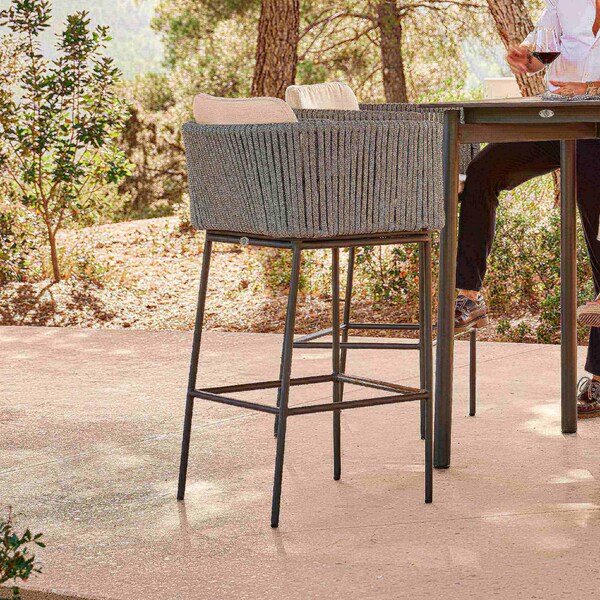A captivating piece that effortlessly transforms any outdoor space into a stylish haven. Its broad backrests lend an intimate and unparalleled charm. The barstool features a powder-coated aluminum frame and a light gray polystrand strap rope. A comfortable cushion is included in 5453 Sunbrella Canvas or you can choose from other available Sunbrella options. Crafted for durability, the chair combines modern elegance with resistance against the elements. Create a personalized outdoor oasis with the Boston Outdoor Barstool, where style, comfort, and durability converge.