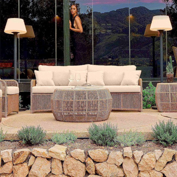 A captivating piece that effortlessly transforms any outdoor space into a stylish haven. Its broad backrests lend an intimate and unparalleled charm. The sofa features a powder-coated aluminum frame and a Ecolene Nigerian Twist weaving. A comfortable cushion is included in 5453 Sunbrella Canvas or you can choose from other available Sunbrella options. Crafted for durability, the sofa combines modern elegance with resistance against the elements. Create a personalized outdoor oasis with the Calixto Outdoor Sofa where style, comfort, and durability converge.
