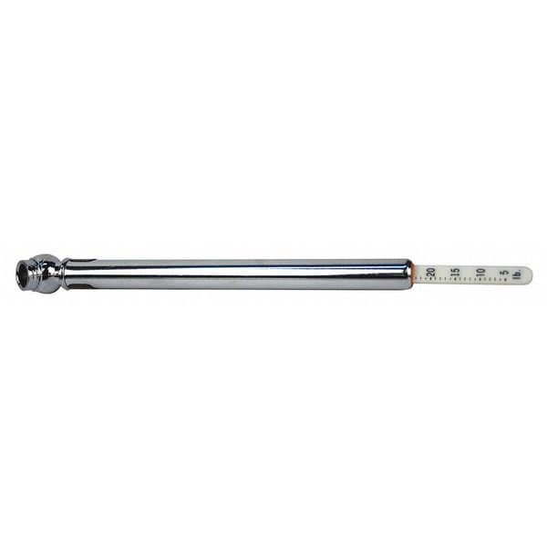 Pencil Tire Gauge, Product Type Tire Pressure Gauge, Gauge Type Pencil, Material Chrome, Overall Length 2 1/2 in, Tread Depth Calibration Increments Not Applicable, Tire Pressure Calibration Increments 2 psi, Minimum Operating Air Pressure 5 psi, Maximum Operating Air Pressure 50 psi, Includes Pocket Clip, Color Chrome, Features Built in Pocket Clip, Reads PSI and kPa, Tire Sensor Safe, Finish Chrome