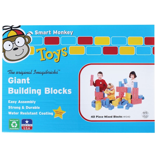 Basic 40pc Block set (assorted sizes and colors). Award-winning ImagiBRICKSTM Giant Building Blocks are an enduring classic that offer endless play possibilities because they are versatile (build with them, jump over them, crash into them) and safe. Constructed of lightweight corrugated cardboard, if the blocks tumble, no one gets hurt! The blocks are printed with non-toxic inks and with their water-resistant coating are strong and durable for years of creative play. Because Imagibricks are unit blocks , they can even be used to teach basic math skills. The blocks come in three sizes and colors and are available in various sets: the large red brick is 12 x 6 x 3 inch, the medium yellow brick is 6 inch x 6 inch x 3 inch, the small blue brick is 6 inch x 3 inch x 3 inch.