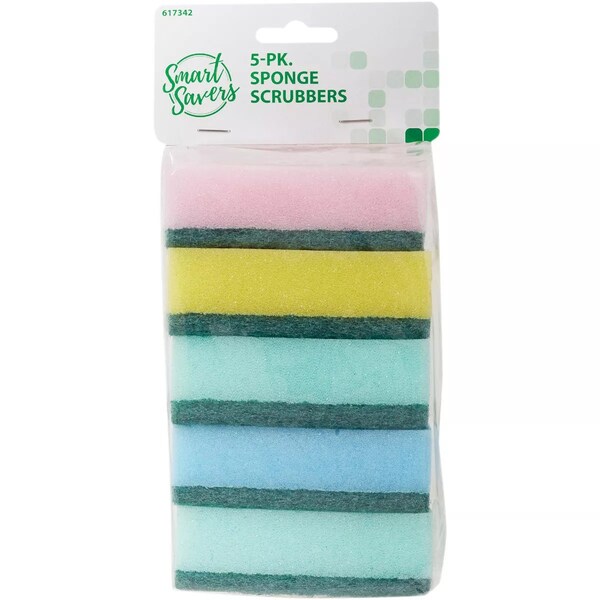 Smart Savers 5-piece sponge scrubbers is ideal for general cleaning. Assorted colors - yellow pink blue green and white.
