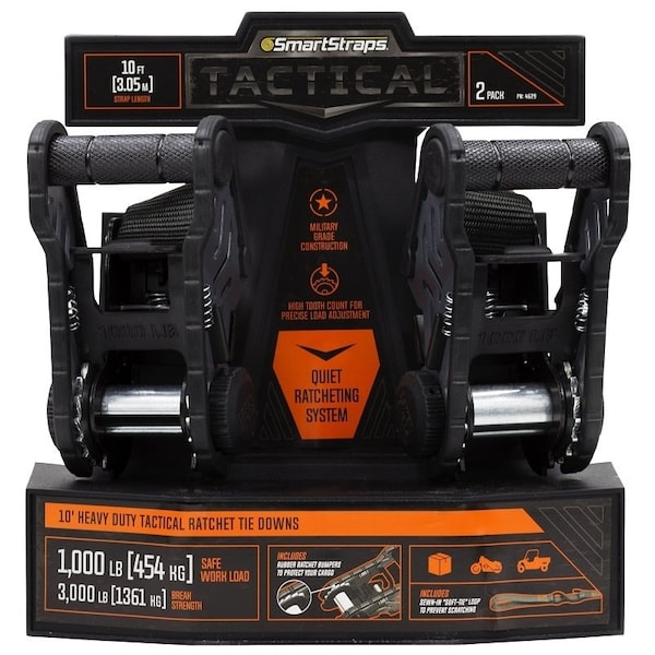 The tactical ratchet tiedown is stronger and more user friendly than standard ratcheting tie downs They can be used for heavier loads often hauled in a large pickup truck or on a medium trailer such as motorcycles, small boats or appliances Provides extralong webbing on attachment end for hardtoreach anchor points Features a diamond knurl handle for increased grip and rubber bumpers along the ratchet to protect your cargo from scratching Use the builtin softtie loop to secure cargo without damaging paint or chrome