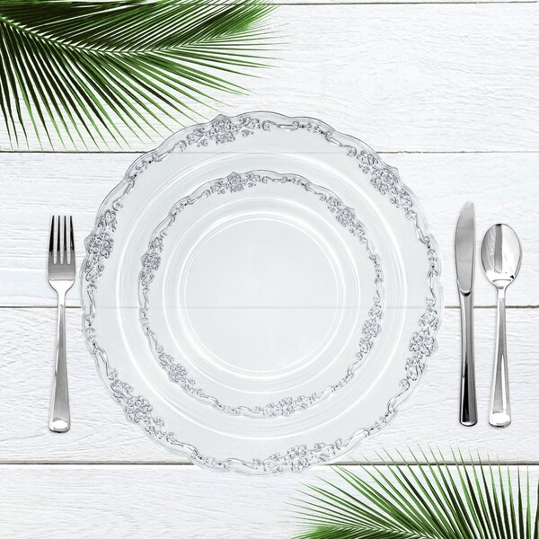 10" Clear with Silver Vintage Rim Round Disposable Plastic Dinner Plates (120 Plates), 120PK