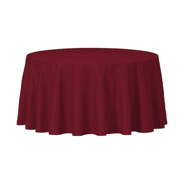 Diameter 84 Case quantity 96 tablecloths Color Burgundy Shape Circular Material Plastic Disposable Onetime, single party use