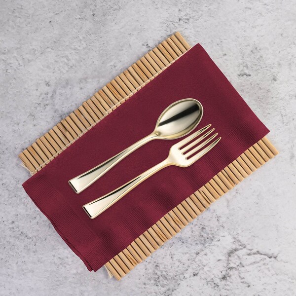 Thickness: 2 Ply Folded dimensions: 8" x 4" Unfolded dimensions: 16" x 16" Case quantity: 12 packs of 50 napkins Color: Burgundy Fold style: Prefolded (1/8 fold) Material: Paper Disposable: One-time party use Recycling code: #22 PAP (Paper)
