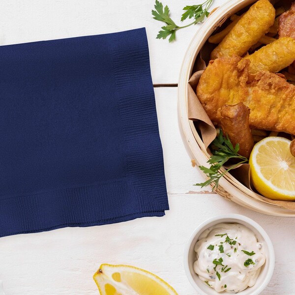 Thickness: 2 Ply Folded dimensions: 5" x 5" Unfolded dimensions: 10" x 10" Case quantity: 12 packs of 50 napkins Color: Navy Blue Shape: Square Material: Paper Disposable: One-time, single party use Recycling code: #22 PAP (Paper)