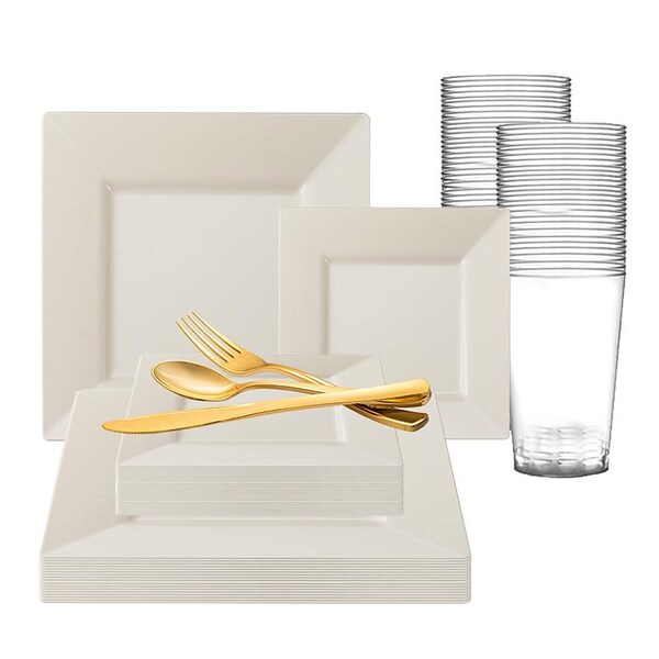 Service for 60 60 Dinner plates, 60 salad plates, 60 forks, 60 spoons, 60 knives and 60 12 oz Tumblers Plates Ivory Flatware Gold Cup Clear Dinner plate SKU 6939 Dinner plate approx outer dimensions 9 12 x 9 12 Dinner plate approx outer rim 2 Dinner plate approx inner dimensions 7 12 x 7 12 Salad plate SKU 6936 Salad plate approx outer dimensions 6 12 x6 12 Salad plate approx outer rim 1 14 Salad plate approx inner dimensions 5 14 x 5 14 Fork SKU7950G Spoon SKU7954G Knife SKU7952G Flatware length 7 12 Cup flush fill capacity 12 oz Cup practical fill capacity 10 oz Cup approx top diameter 3 Cup approx bottom diameter 2 Cup approx height 4 12 Material Plastic Disposable Onetime, single party use Recycling code 6 PS Polystyrene BPAfree Yes