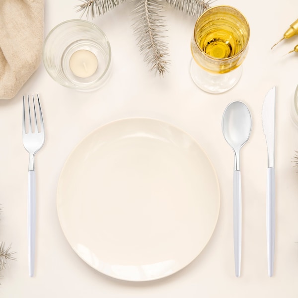 Silver with White Handle Moderno Disposable Plastic Dinner Spoons (240 Spoons)