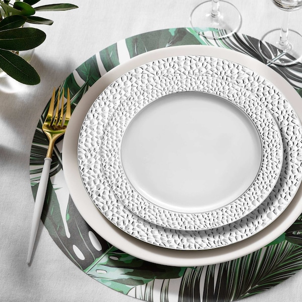 White with Silver Hammered Rim Plastic Dinnerware Value Set (120 Dinner Plates + 120 Salad Plates)