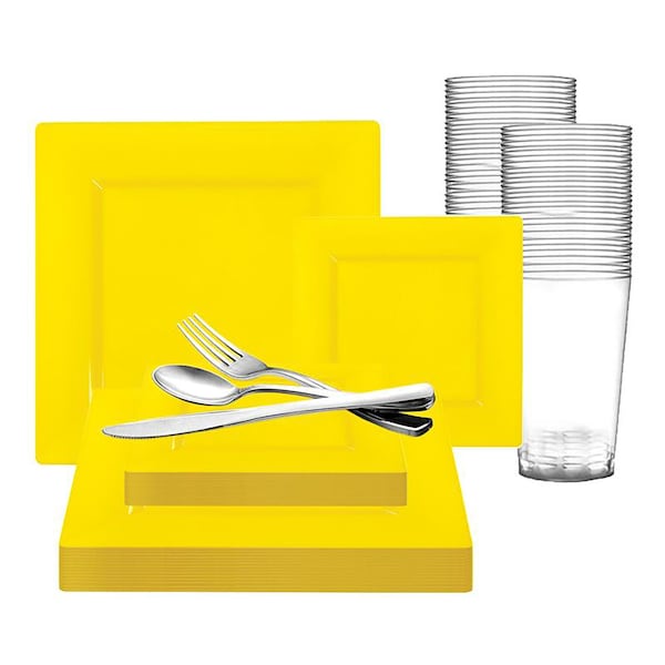 Service for 60 60 Dinner plates, 60 salad plates,60 forks,60 spoons,60 knives and 60 12 oz Tumblers PlatesYellow Flatware Silver Cup Clear Dinner plate SKU6809 Dinner plate approx outer dimensions 9 12 x 9 12 Dinner plate approx outer rim dimensions 2 Dinner plate approx inner dimensions 7 12 x 7 12 Salad plate SKU6806 Salad plate approx outer dimensions 6 12 x 6 12 Salad plate approx outer rim dimensions 1 14 Salad plate approx inner dimensions 5 14 x 5 14 Fork SKU7955S Spoon SKU7959S Knife SKU7957S Flatware length 7 12 Cup flush fill capacity 12 oz Cup practical fill capacity 10 oz Cup approx top diameter 3 Cup approx bottom diameter 2 Cup approx height 4 12 Material Plastic Disposable Onetime, single party use Recycling code 6 PS Polystyrene BPAfree Yes