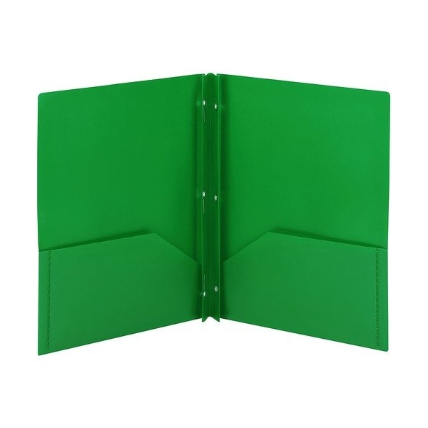 Keep documents organized and safe using these Poly Two-pocket Folders with fasteners that come in convenient three-packs. They are perfect for all types of presentations, proposals and projects. They allow easy storage and transport while keeping your letter-size documents organized and easily accessible. Two large, 4-1/2'' high pockets each hold up to 50 sheets. Metal, tang-style fasteners hold up to 80 three-hole punched papers. Inside back pocket is die-cut to hold a business card. Durable poly material is tear-resistant, water-resistant and easy to clean.