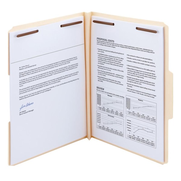 Top-tab folders feature enamel-finished fasteners to provide superior strength in securing large amounts of paper. 2" prong B-style fasteners are in positions 1 and 3. Folders have 1-1/2" a W-fold expansion and two-ply tabs in assorted 1/3-cut positions. Made of 14 point stock.