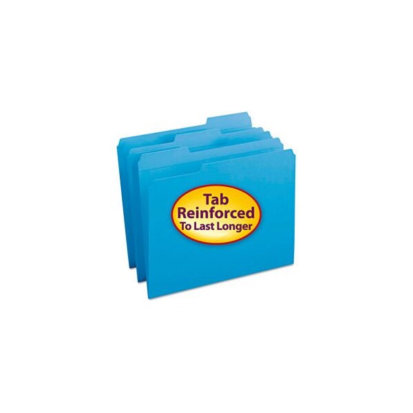 Use a rainbow of colors to categorize different types of folders, which speeds filing and retrieval time, or to complement your company colors or decor. Multiple tab positions to fit any vertical or lateral filing system. Reinforced tab adds strength where you need it most. Made of 11 point colored stock for everyday use. File Folder Size Type: Letter; File Folder Color: Blue; Color Family: Blue; File Folder Material: 11-pt Stock.