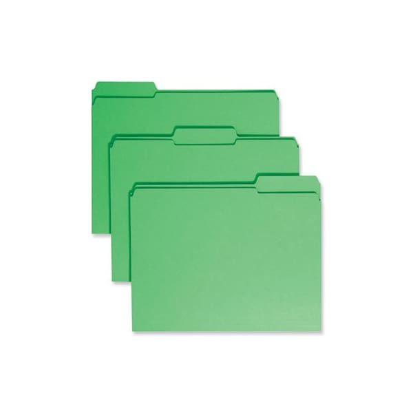 Use a rainbow of colors to categorize different types of folders, which speeds filing and retrieval time, or to complement your company colors or decor. Multiple tab positions to fit any vertical or lateral filing system. Reinforced tab adds strength where you need it most. Made of 11 point colored stock for everyday use. File Folder Size Type: Letter; File Folder Color: Green; Color Family: Green; File Folder Material: 11-pt Stock.