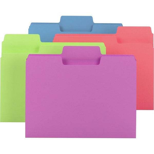 Find critical files fast with SuperTab file folders. Get nearly double the labeling area of standard file folders so you can write larger or use more lines of description. These sturdy, durable file folders fit any vertical or lateral filing system. The SuperTab offers a 90 percent larger label area than tabs on standard folders for improved labeling. Your labels will be easy to see because you can use larger text or more lines of text. Extra-wide, 1/3-cut tabs are 7/8" high. Letter-size folders are made of 11 point stock and scored for 3/4" expansion. Assorted colors include Bright Purple, Bright Pink, Bright Green and Bright Blue.
