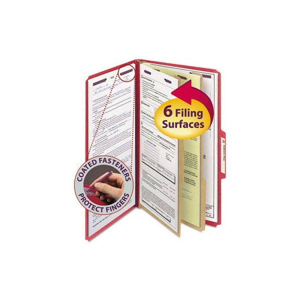 Protect your documents and fingers with Smead patented SafeSHIELD Coated Fastener Technology; the ultimate solution to fastener issues, including paper tears, finger cuts and excessive fastener crinkling. Use colors to signal category or type of project at a glance. Sturdy tear resistant gusset expands to hold up to 2in of material. Two dividers provide six filing surfaces for ultimate organization. Folder Size: Legal; Total Number of Dividers: 2; Total Number of Fasteners: 6; Max Folder Expansion: 2in.