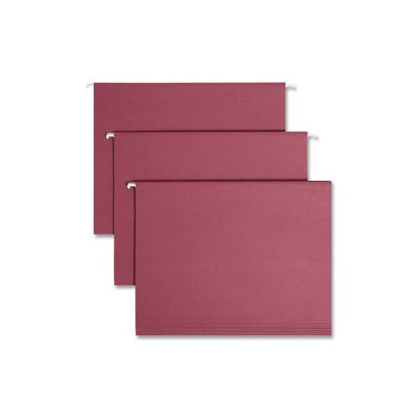Choose from an assortment of bright colors to code different types of files and complement your office decor. Use with colored interior folders to prevent misfiling. Keep your papers neatly upright in desk drawers and file cabinets. Each hanging folder features a 1/5-cut repositionable poly tab and coated rod tips that slide easily in file drawers for hassle-free organizing and access to documents. The clear poly tabs have replaceable white tab inserts and can be positioned in several locations on the front or back panel so you can create a customized filing system. Folder Size Type: Letter; Folder Color: Maroon; Color Family: Red; Folder Material: 11-pt Stock.