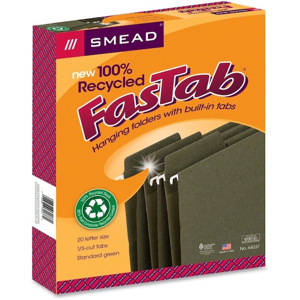 Eco-friendly FasTab hanging folders offer built-in, heavy-duty reinforced tabs permanently attached to the folder. No assembly is required. They are easy to label by either writing directly on the tab or applying self-adhesive labels. Paper is glued around rods on both sides. Rods have coated tips. Tabs are 20 percent larger than standard 1/3-cut tabs and embossed for label placement. Letter-size hanging folders are made of 11 point color stock with a high percentage of post-consumer material.