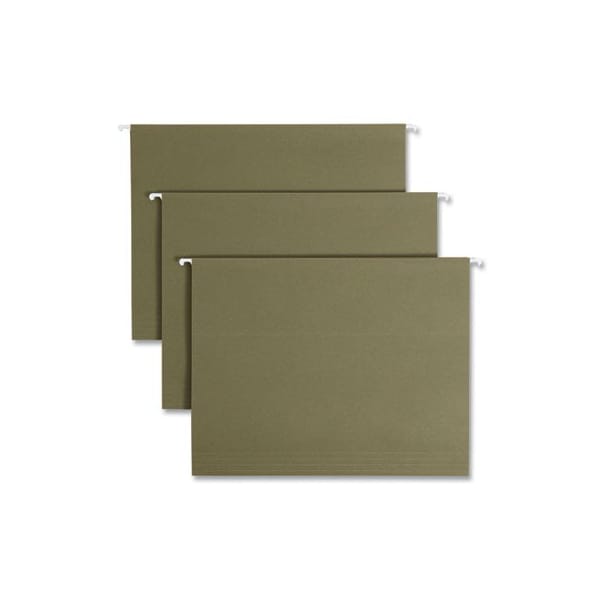 Hanging file folders keep your papers neatly upright in desk drawers and file cabinets. Each hanging file folder features a 1/5-cut repositionable poly tab and coated rod tips that slide easily in file drawers for hassle-free organizing. The clear poly tabs have replaceable white inserts and can be positioned in several locations on the front or back panel so you can create a customized filing system. A lighter green color on the inside of the folder helps prevent accidental filing of papers between folders, ensuring all paperwork stays organized correctly. Folder Size Type: Letter; Max Folder Expansion: 1in; Folder Color: Standard Green; Color Family: Green.