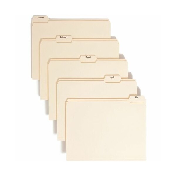 INDEXED FILE FOLDERS, 1/5 CUT, INDEXED JAN-DEC, TOP TAB, LETTER, MANILA, 12/SET