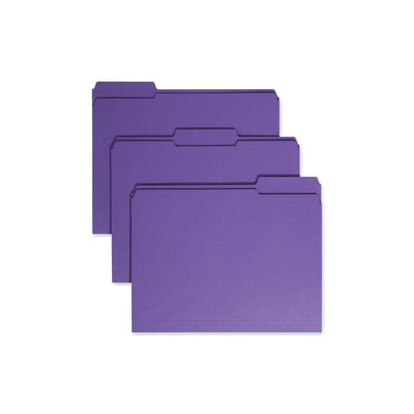 Use a rainbow of colors to categorize different types of folders, which speeds filing and retrieval time, or to complement your company colors or decor. Multiple tab positions to fit any vertical or lateral filing system. Reinforced tab adds strength where you need it most. Made of 11 point colored stock for everyday use. File Folder Size Type: Letter; File Folder Color: Purple; Color Family: Purple; File Folder Material: 11-pt Stock.