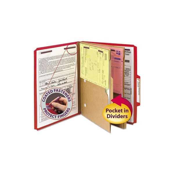 The ultimate classification folder when safety and security are most important. SafeSHIELD bonded fasteners add protection for papers and fingers, while also reducing fastener crinkling. Two pocket-style dividers for materials that cannot be punched or stapled. Made of pressboard for extra durability. Variety of colors for color-coding projects. Folder Size: Letter; Total Number of Dividers: 2; Total Number of Fasteners: 6; Max Folder Expansion: 2in.