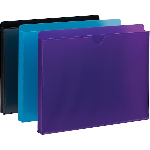 Poly Expanding Jackets allow even the biggest projects to be easily organized and stored in one file jacket. Clear sleeve on the front is handy storage for an often-referenced document such as a calendar, project plan or a to-do list. Clear sleeve includes a thumb notch for easy insertion and removal of documents. Full-height gusset allows expansion, and jacket is closed on three sides. Straight-cut tab allows detailed labeling. Poly Expanding Jackets work well with coordinating Smead SuperTab Poly File Folders or other Smead letter-size file folders. Durable, translucent poly material is tear-resistant, water-resistant and easy to clean. Assorted colors are purple, black and teal.