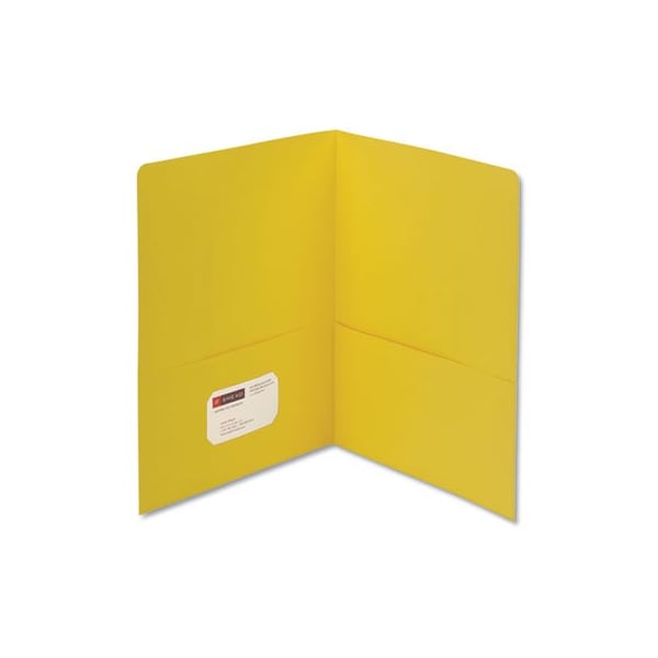 Large pockets safely hold documents, photos or certificates for easy transport while keeping the material immediately accessible. The left pocket is die cut for a title or business card. Heavyweight textured stock makes a distinctive impression. Two 4.5in high inner pockets give easy access to materials. Each pocket holds up to 50 sheets of paper. Reinforced at the sides and closed in the center for extra durability. Front Cover Colors: Yellow; Color Family: Yellow; Back Cover Colors: Yellow; Sheet Size: 11 x 8.5.