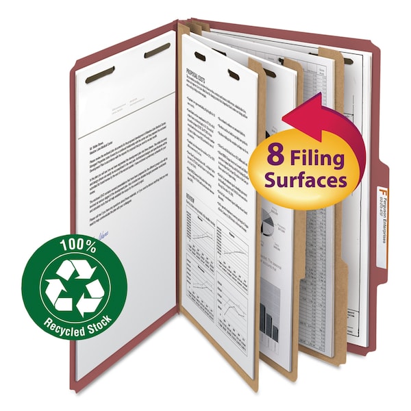 SmeadĀ® 100% Recycled Pressboard Classification Folders, 3 Dividers, Legal Size, Red, 10/Box