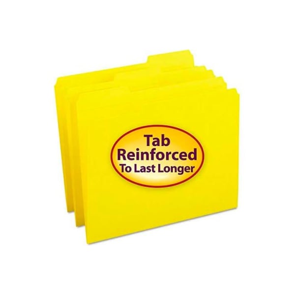Smead file folders, 1/3 cut, reinforced top tab, letter, yellow, 100/box reinforced tabs for extra durability and longer life. Use color for categorizing file folder type: top tab; size: letter; folder material: 11 pt. Stock; color(s): yellow. this product arrives to most customers in 2-3 business days.