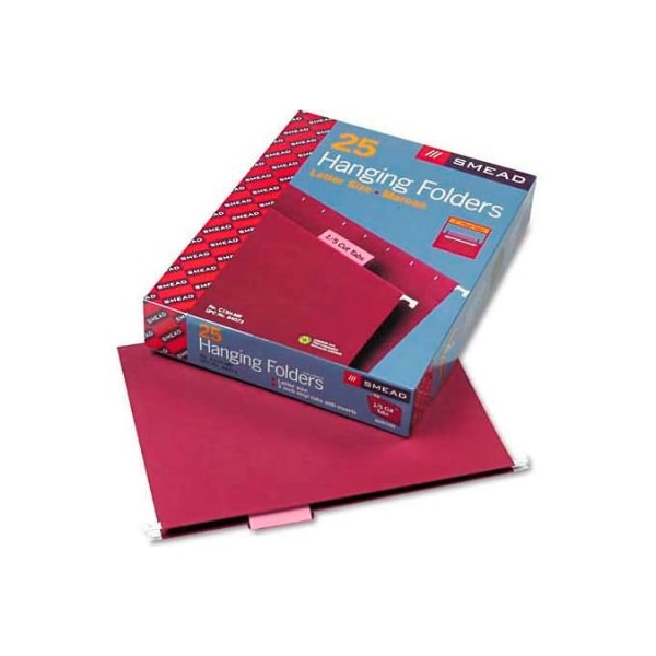Smead hanging file folders, 1/5 tab, 11 point stock, letter, maroon, 25/box hanging folders keep papers neatly vertical in the file. No more slumping folders or folders that slip under one another. Vivid colors help you code files for quick, easy identification. Color-coordinated tabs and inserts included. Hanging file folder type: standard; size: letter; material(s): 11 pt. Stock. this product arrives to most customers in 2-3 business days.