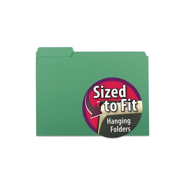 Keep documents organized when removed from the file drawer. These special size folders fit neatly inside hanging folders so the tabs are hidden when returned to the file. Assorted tab positions allow more than one interior folder to be used within a single hanging folder. Manila and multiple distinctive colors allow efficient color coding. These folders are made of 11 point stock for everyday use File Folder Size Type: Letter; File Folder Color: Green; Color Family: Green; File Folder Material: 11-pt Stock.