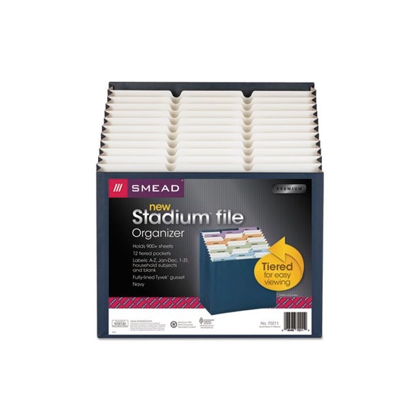 The 12-pocket Stadium file is ideal for clearing clutter from your workspace or countertop. You can turn piles into files with this tiered expanding file that lets you see everything at a glance. The pockets are tiered and fixed so the papers don't fall to the bottom of the file. It is great for organizing both papers and folders. Fully lined tear-resistant gussets. Includes labels with alphabetic A-Z, monthly January-December, daily 1-31, household subjects and blank indexing. Pocket/Wallet Type: Files/Papers; Size: Letter; Colors: Navy; Color Family: Blue.