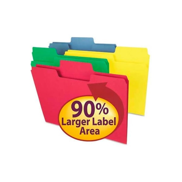 Smead supertab colored file folders, 1/3 cut, letter, assorted, 100/box designed with tabs that have 90% more labeling area for improved labeling. Labels are easier to see using larger text or more lines of text can be visible. File folder type: top tab; size: letter; folder material: 11 pt. Stock. this product arrives to most customers in 2-3 business days.