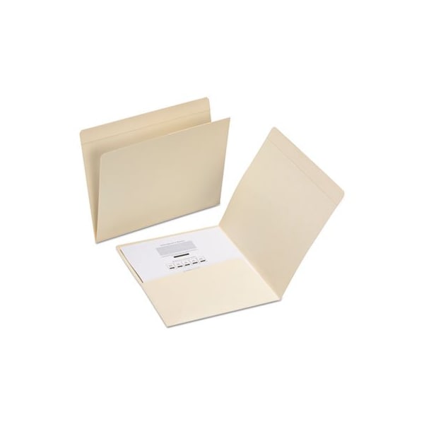 Convenient pocket flap holds papers secure in folder without punching. Pocket is open on top and inside edge for easy removal of papers. Slit-punched to add fasteners sold separately. Made of 11 point manila stock for everyday use. Features reinforced straight-cut tab and 9inw x 5.75inh pocket inside front panel. File Folder Size Type: Letter; File Folder Color: Manila; Color Family: Manila; File Folder Material: 11-pt Manila.