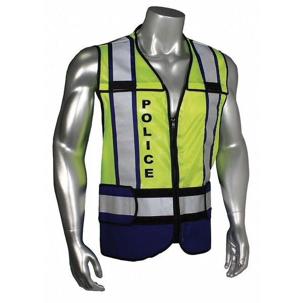 High Visibility Green, Police, Vest Size M/XL, Vest Closure Type Zipper, Hook-and-Loop, Vest Material Polyester, Fits Chest Size 42 In. to 60 In., Vest Length 24 in, Stripe Color Silver, Standards ANSI 207-2011